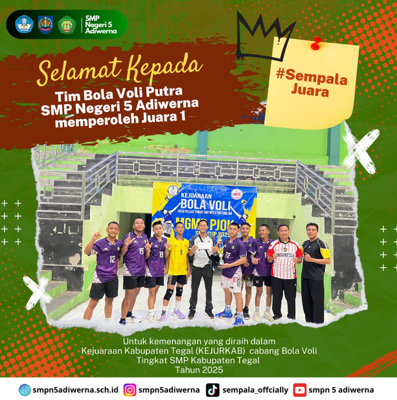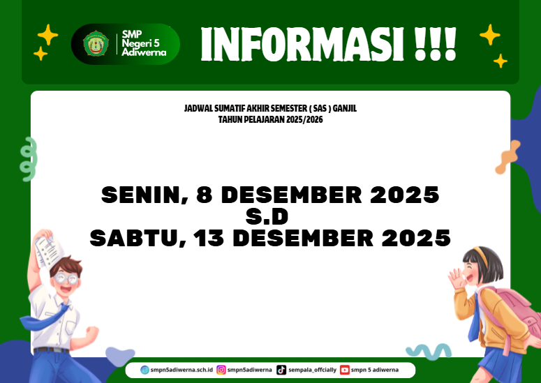 Alhamdulillahi robbil alamin kami panjatkan kehadlirat Allah SWT, karena atas limpahan rahmat, dan karunia-Nya sehingga Website sekolah dengan domain https://smpn5adiwerna.sch.id/ dapat dibuka dan terus kita kembangkan. Kami selaku pimpinan sekolah mengucapkan terima kasih kepada tim pengelola Website yang telah berusaha untuk dapat lebih memperkenalkan segala perihal yang dimiliki oleh sekolah dan juga kepada semua fihak yang sudah me ... Selengkapnya....