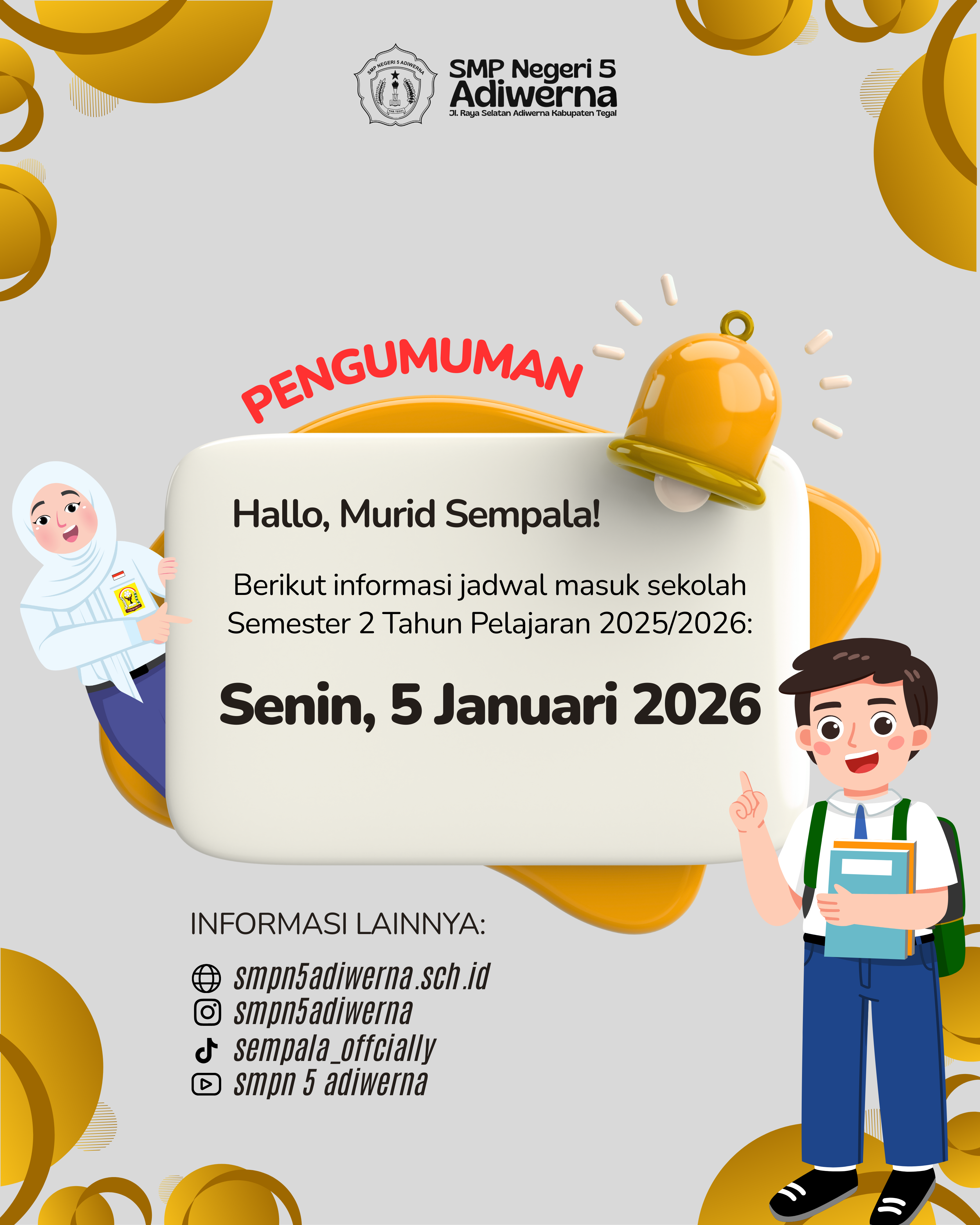 Alhamdulillahi robbil alamin kami panjatkan kehadlirat Allah SWT, karena atas limpahan rahmat, dan karunia-Nya sehingga Website sekolah dengan domain https://smpn5adiwerna.sch.id/ dapat dibuka dan terus kita kembangkan. Kami selaku pimpinan sekolah mengucapkan terima kasih kepada tim pengelola Website yang telah berusaha untuk dapat lebih memperkenalkan segala perihal yang dimiliki oleh sekolah dan juga kepada semua fihak yang sudah me ... Selengkapnya....